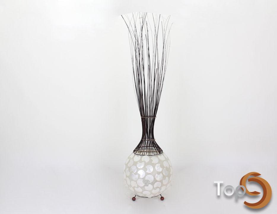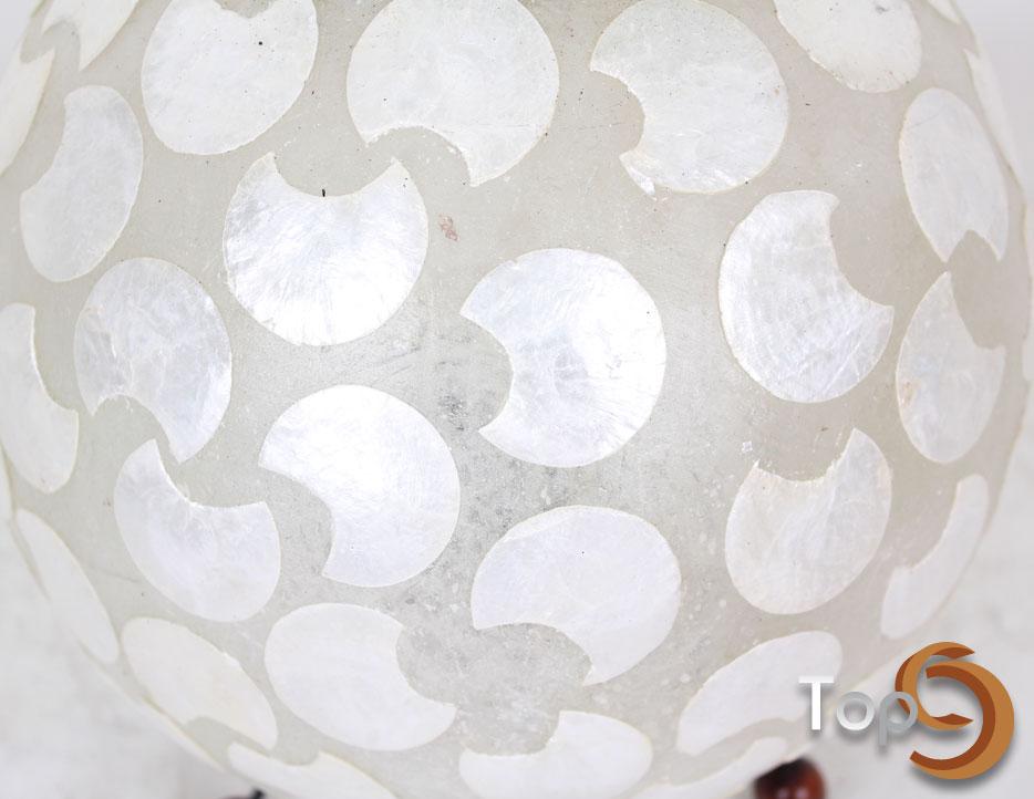 A ball shaped lamp with half moon shells, palm leaves ribs, and beads decoration