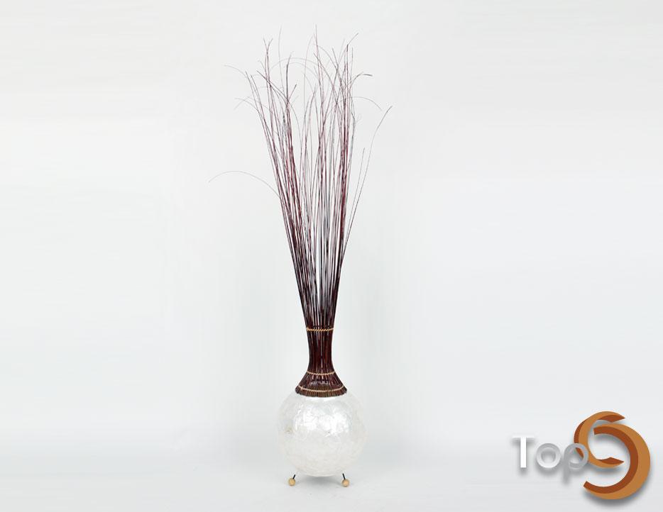 A ball shaped lamp made from shells, combined with palm leaves ribs