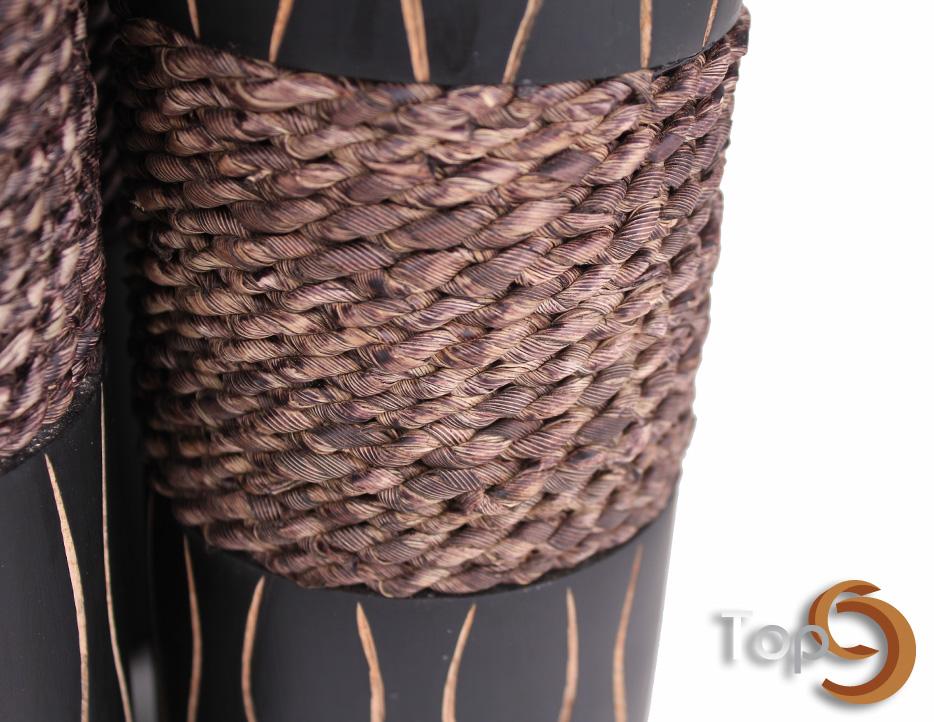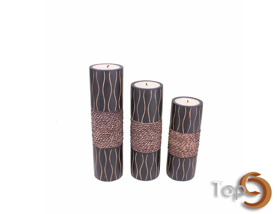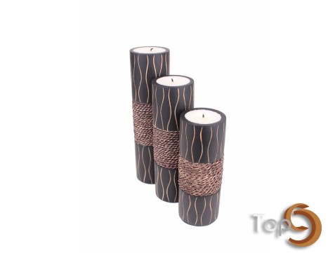 A set of 3 wooden candle holders with banana tree fiber decoration