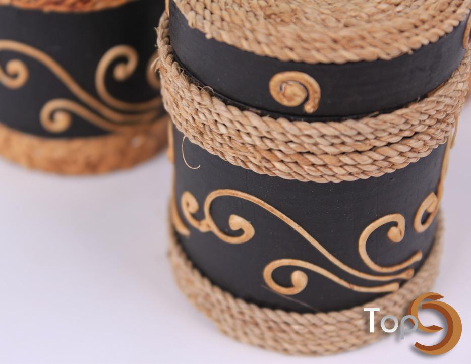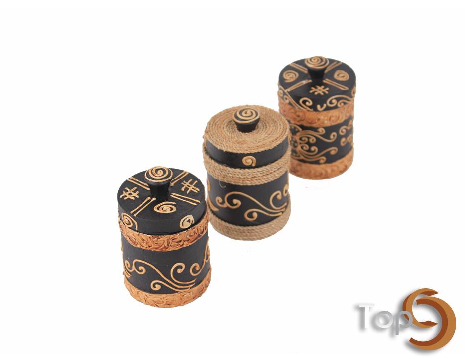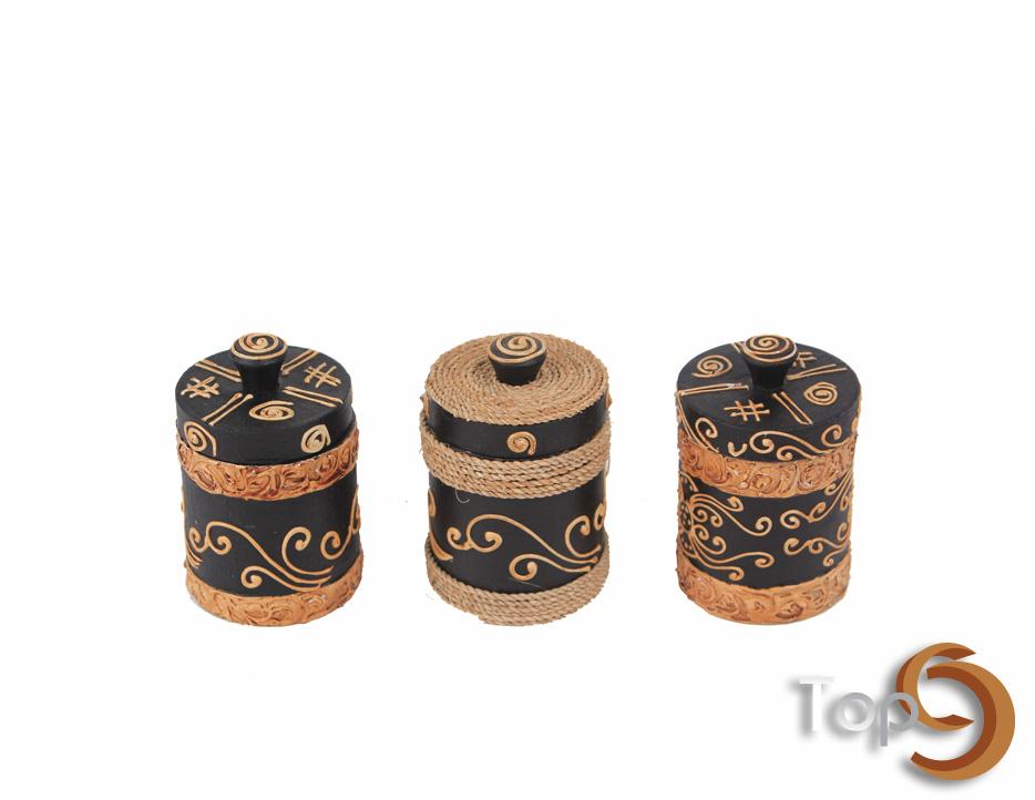 A set of 3 antique cylinder wooden jars and lids with decorative pattern