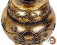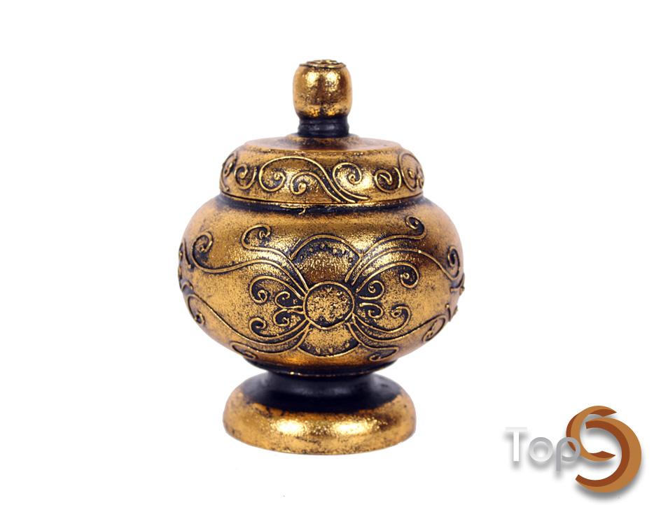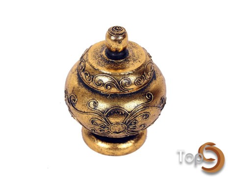An antique round wooden jar and lid with decorative pattern, gold color