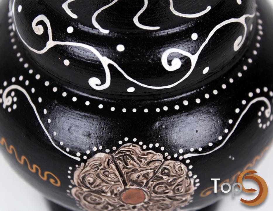 An antique round wooden jar and lid with decorative pattern, black color