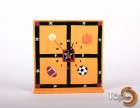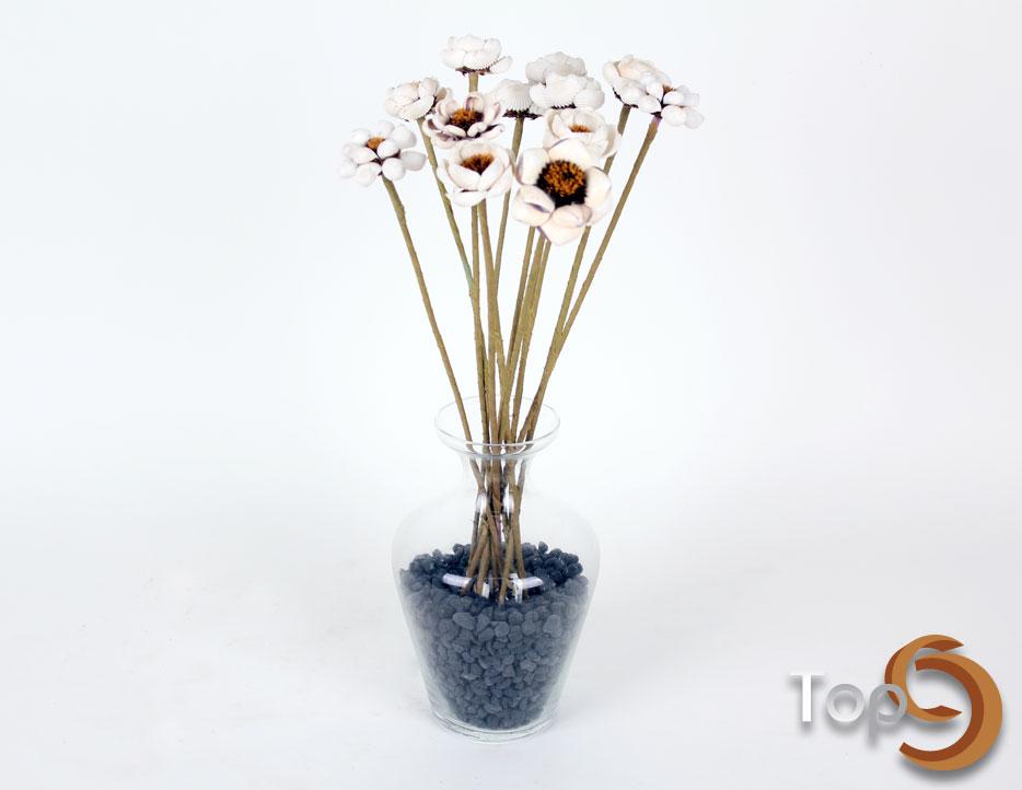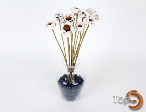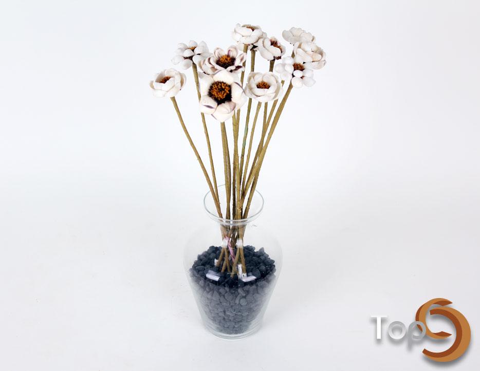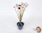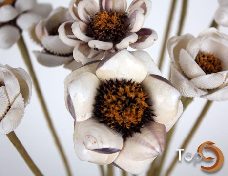 Artificial shell flower arrangement made from shells with black stones in a round glass vase