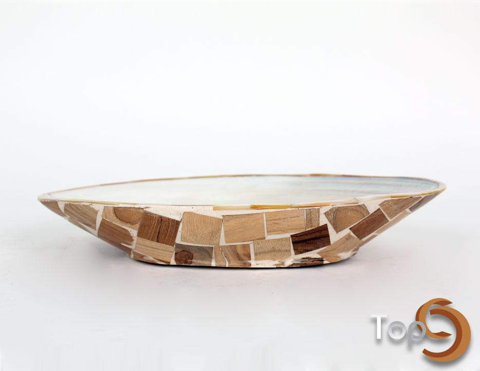Description An oval bowl made from shells on the inside and wood on the outside
