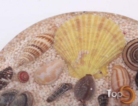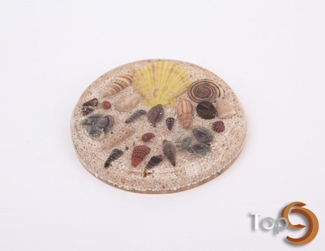 A round glass coaster with shells & sand decoration inside