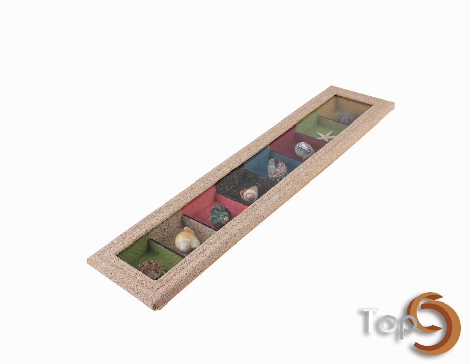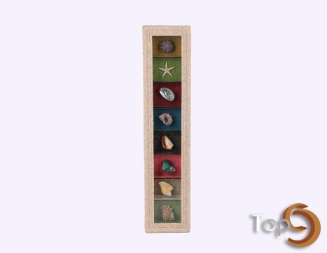 A rectangle wall art with 8 colorful boxes inside filled with shells and sand decoration