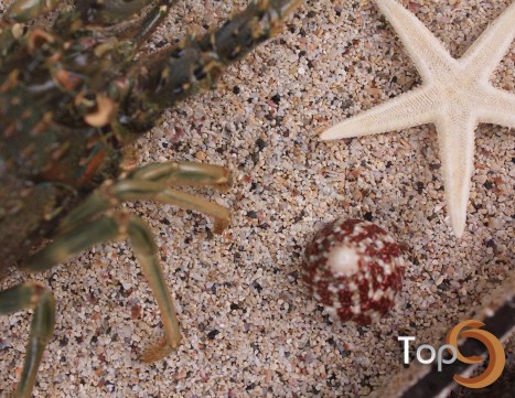 A rectangle wall art with 17 boxes inside filled with lobster, shells and sand decoration