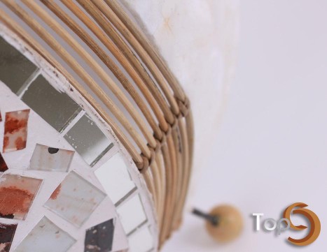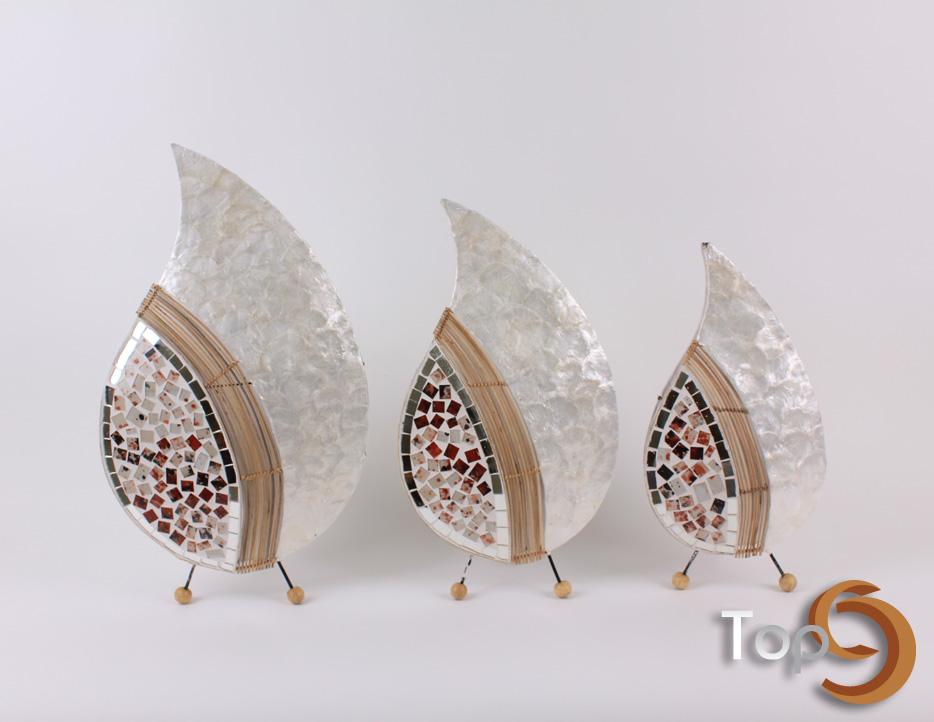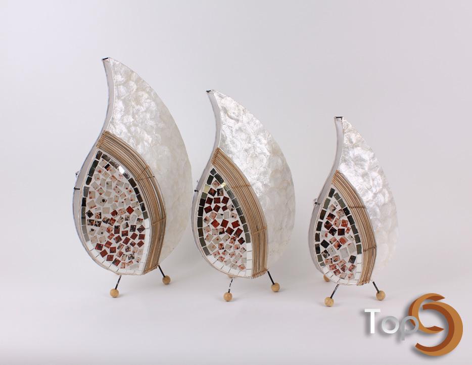 Description A set of 3 table lamps made from shells with palm leaves ribs and glass decoration on the bottom side