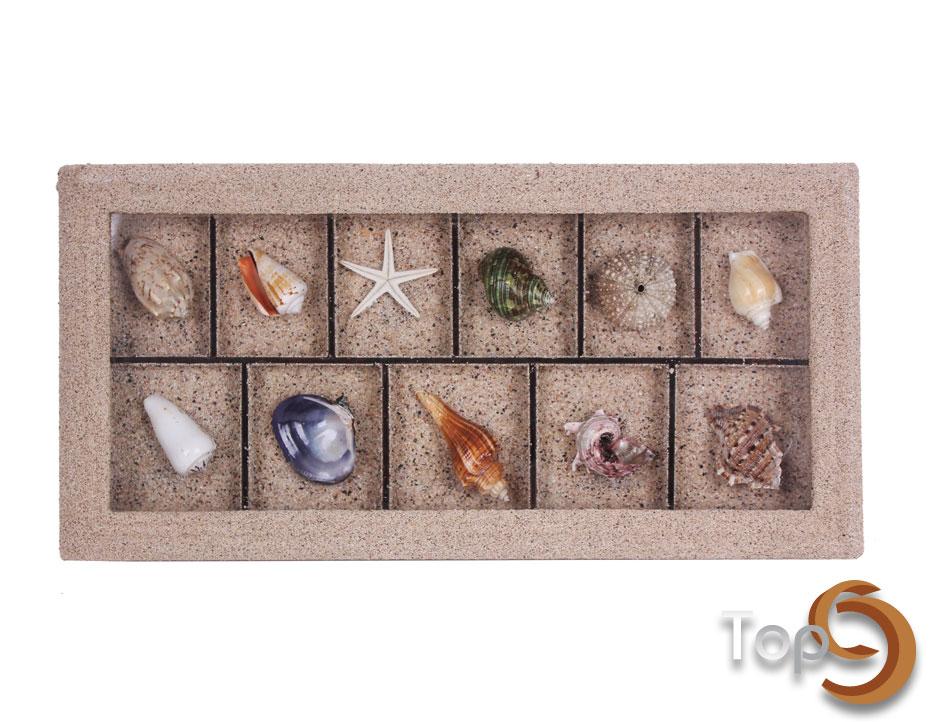 Description A rectangle wall art with 11 boxes inside filled with shells and sand decoration