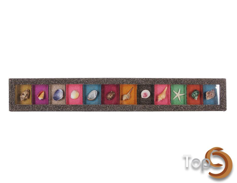 A rectangle wall art with 12 colorful boxes inside filled with shells and sand decoration
