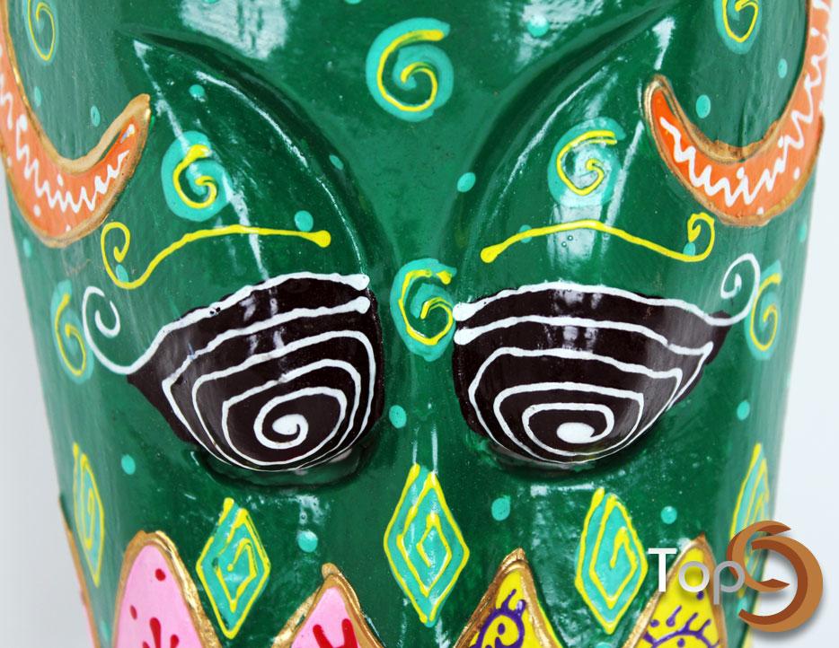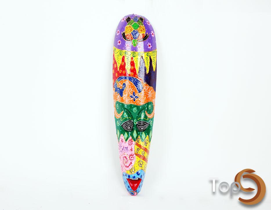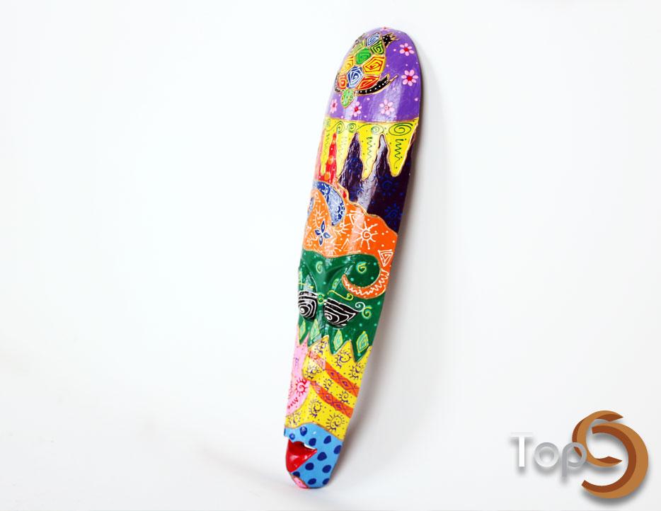 A wooden mask with colorful painting