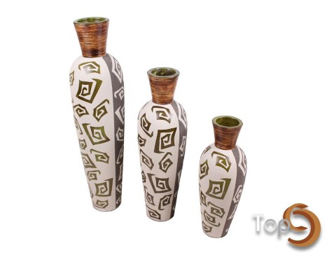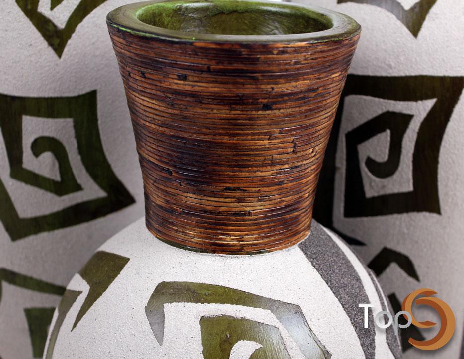 Description An oval vase with rattan wrapped vase neck, sand decoration and green square spiral motif