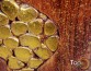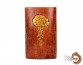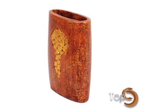 A wooden oval vase with gold shimmer and abstract gold key motif