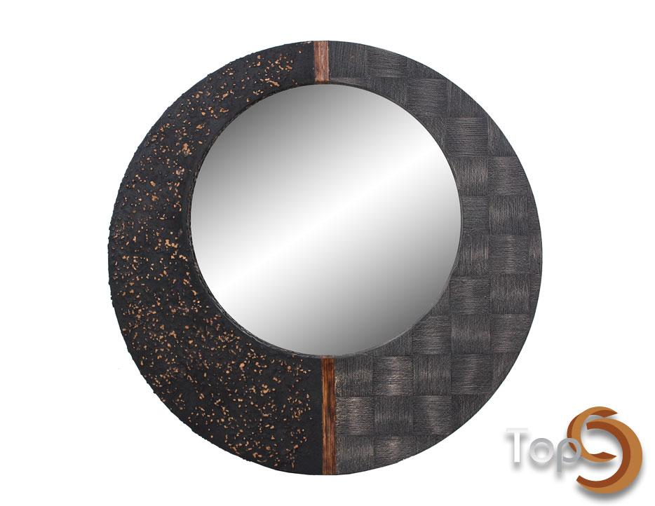 A round wall mirror with rattan decoration, line and random textured frame