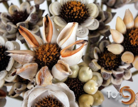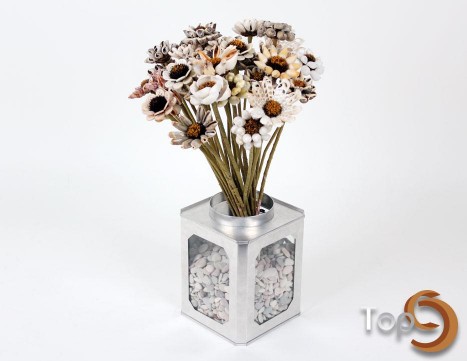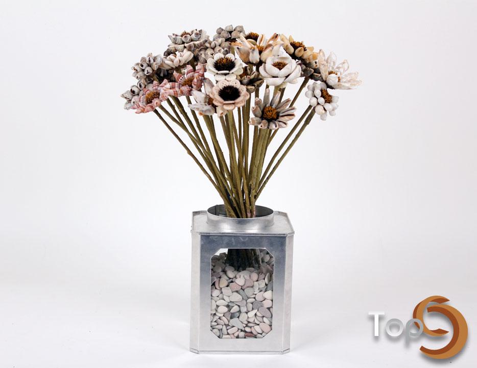 Description Artificial flower arrangement made from shells with mix stones in a square aluminium glass vase