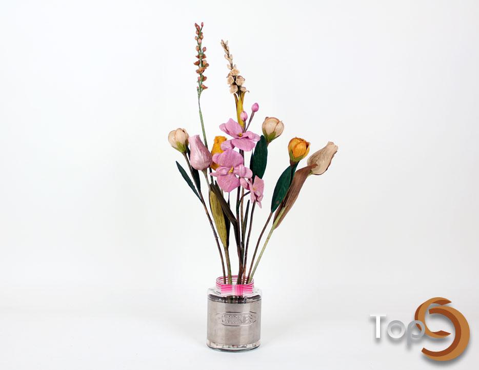 Artificial flower arrangement with white stones in an aluminium glass vase