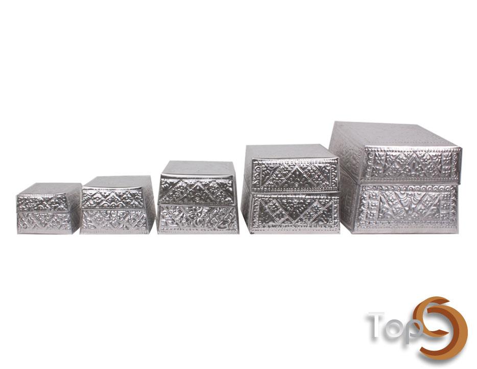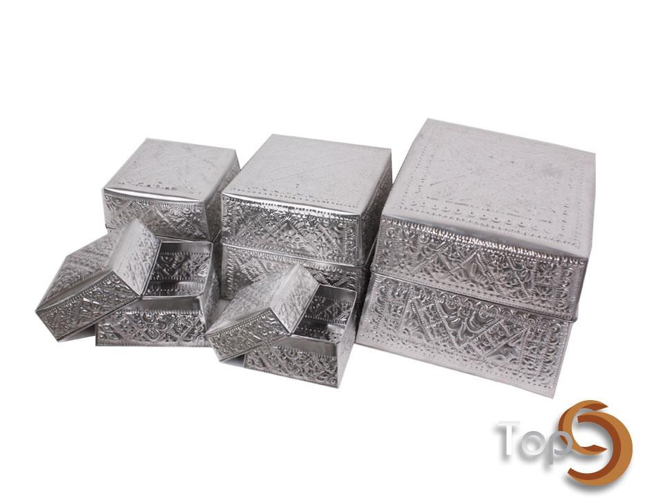A set of 5 square aluminium boxes with beautiful carving, can be puted in the largest box.
