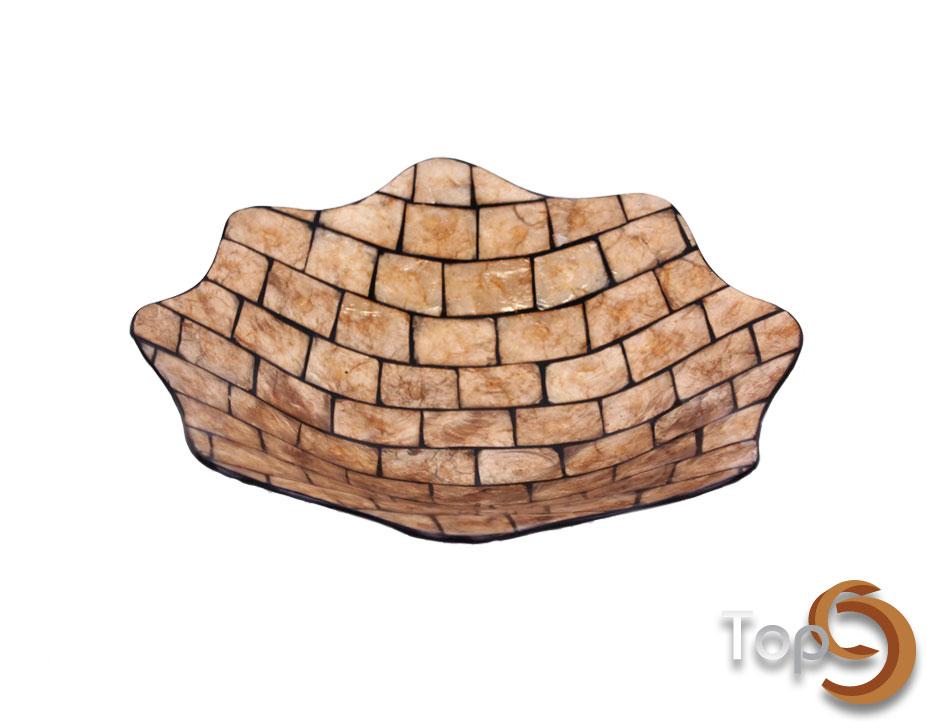 A large flower shaped bowl made from shells with many motifs