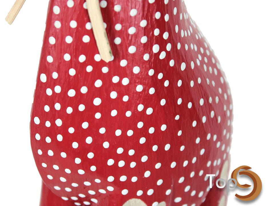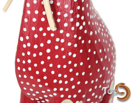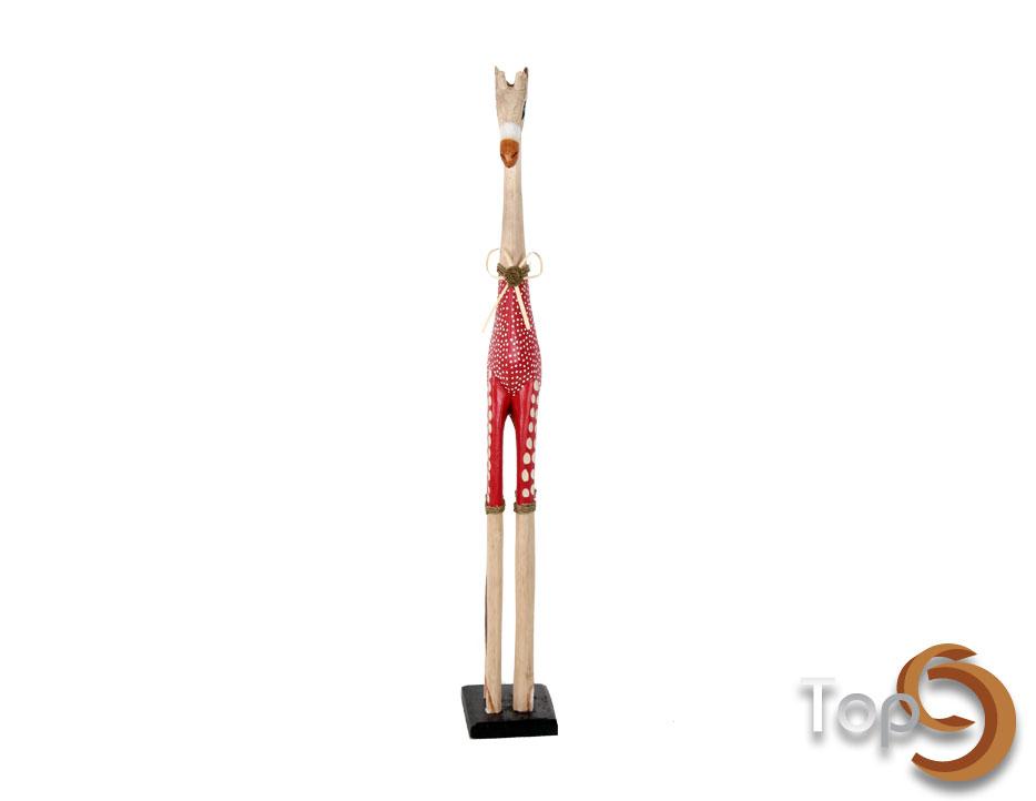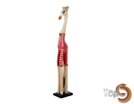 A wooden giraffe statue with polkadot clothes