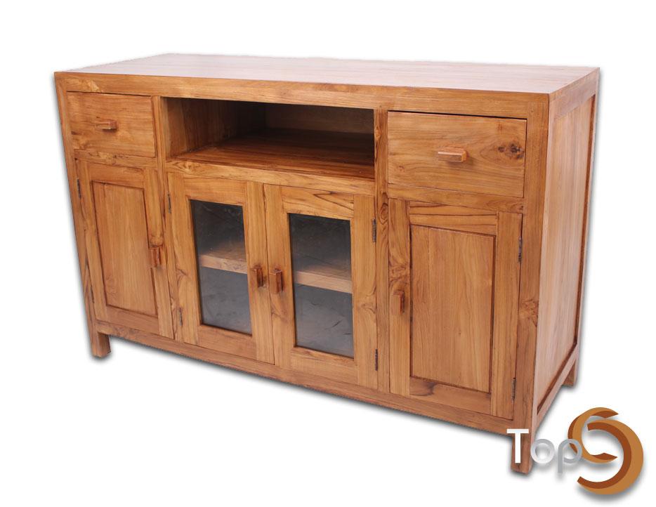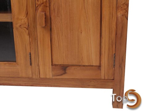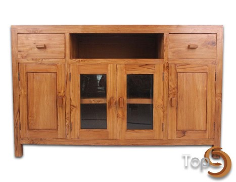 A cabinet with 2 drawers, 1 shelf, 2 board doors and 2 glass doors
