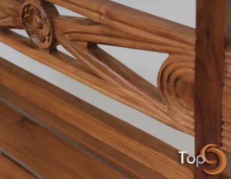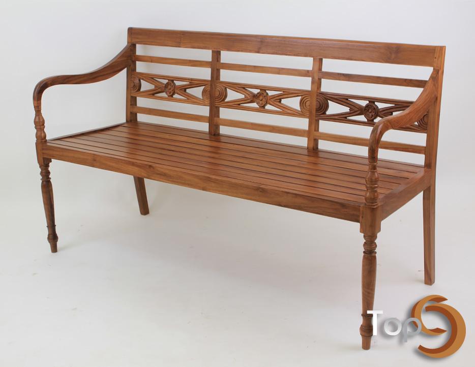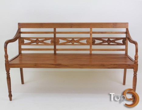 A classical ornamented back bench with natural finishing and arrow legs. Made from Solid Teakwood