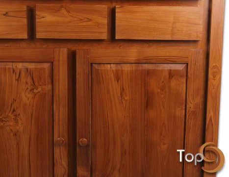 A cabinet with 3 drawers, 2 board doors and 2 glass doors