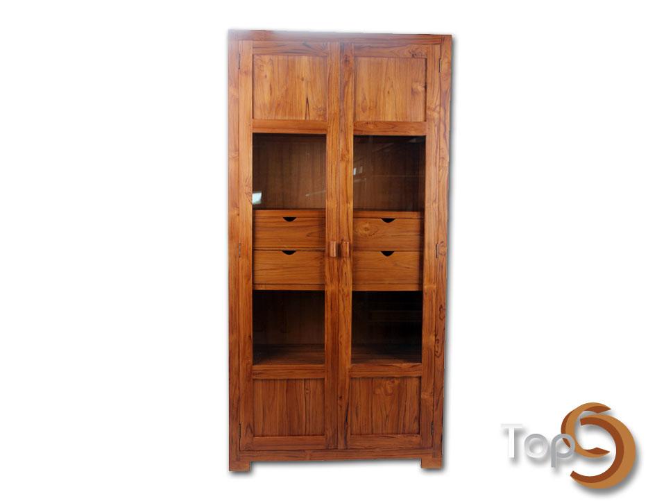 A cabinet with 4 drawers and 2 glass doors