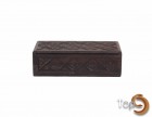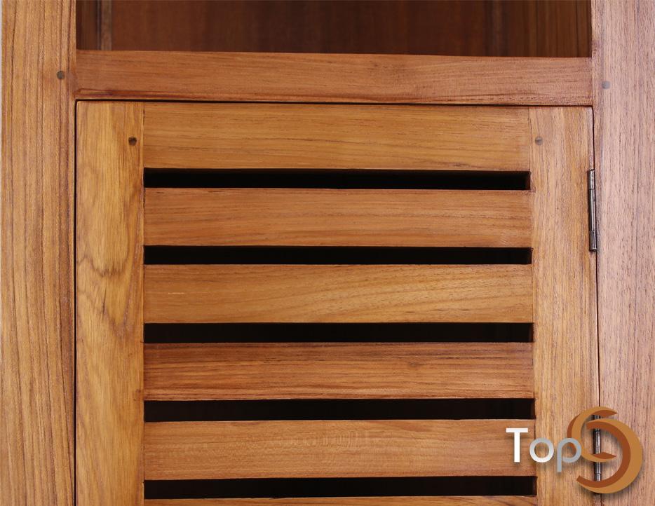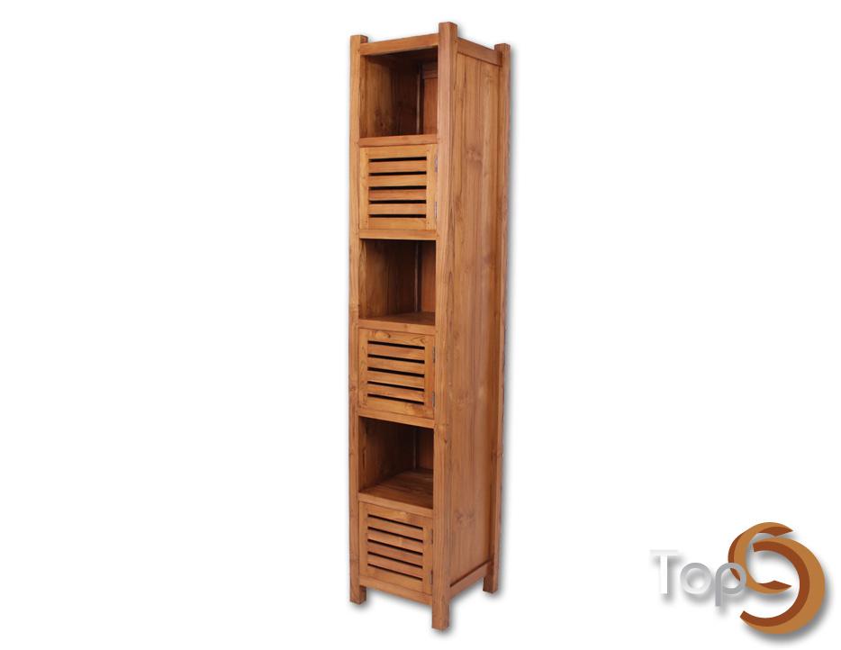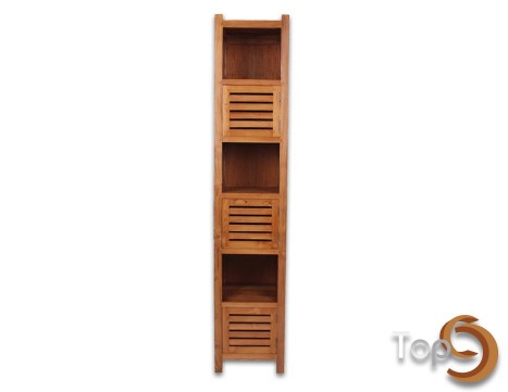A cabinet with 3 opened shelves and 3 closed shelves with slat doors