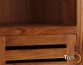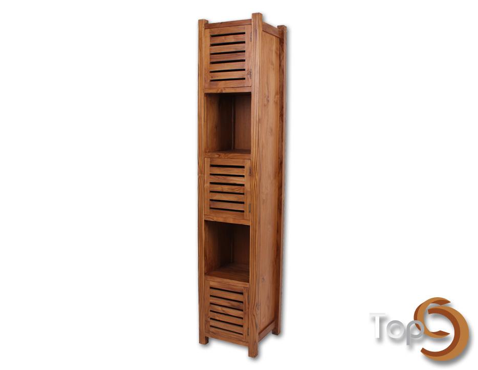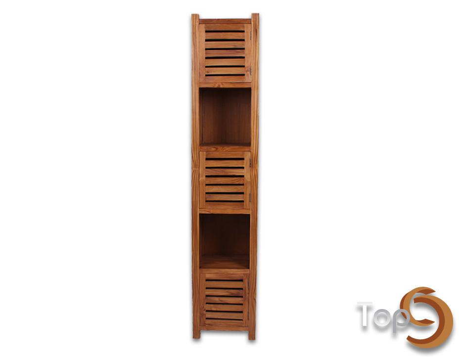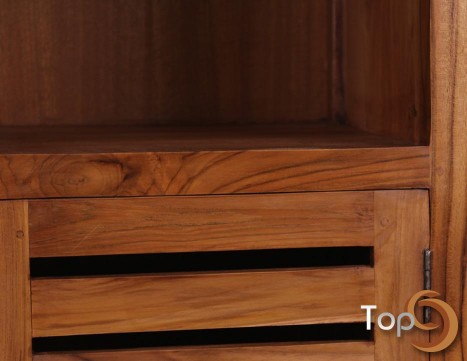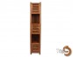 Description A cabinet with 2 opened shelves and 3 closed shelves with slat doors